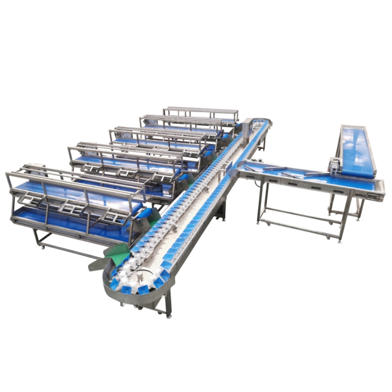 料盒分选机适合分选鸡副产品、鸭副产品、禽类冰冻产品、干湿海参、大虾、牡蛎、小龙虾、鱼及其他干果等产品的在线称重分级,配套自动投料设备,可大幅度提高产品生产效率。
